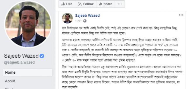 সংবাদ বাংলা: প্রধানমন্ত্রীর ছেলে ও তাঁর তথ্যপ্রযুক্তি-বিষয়ক উপদেষ্টা সজীব ওয়াজেদ জয় বলেছেন, মার্কিন প্রেসিডেন্ট ডোনাল্ড ট্রাম্প ও তাঁর সরকার অন্যান্য দেশের অভ্যন্তরীণ বিষয়ে হস্তক্ষেপ করার নীতিতে বিশ্বাসী নন। তাঁরা প্রিয়া